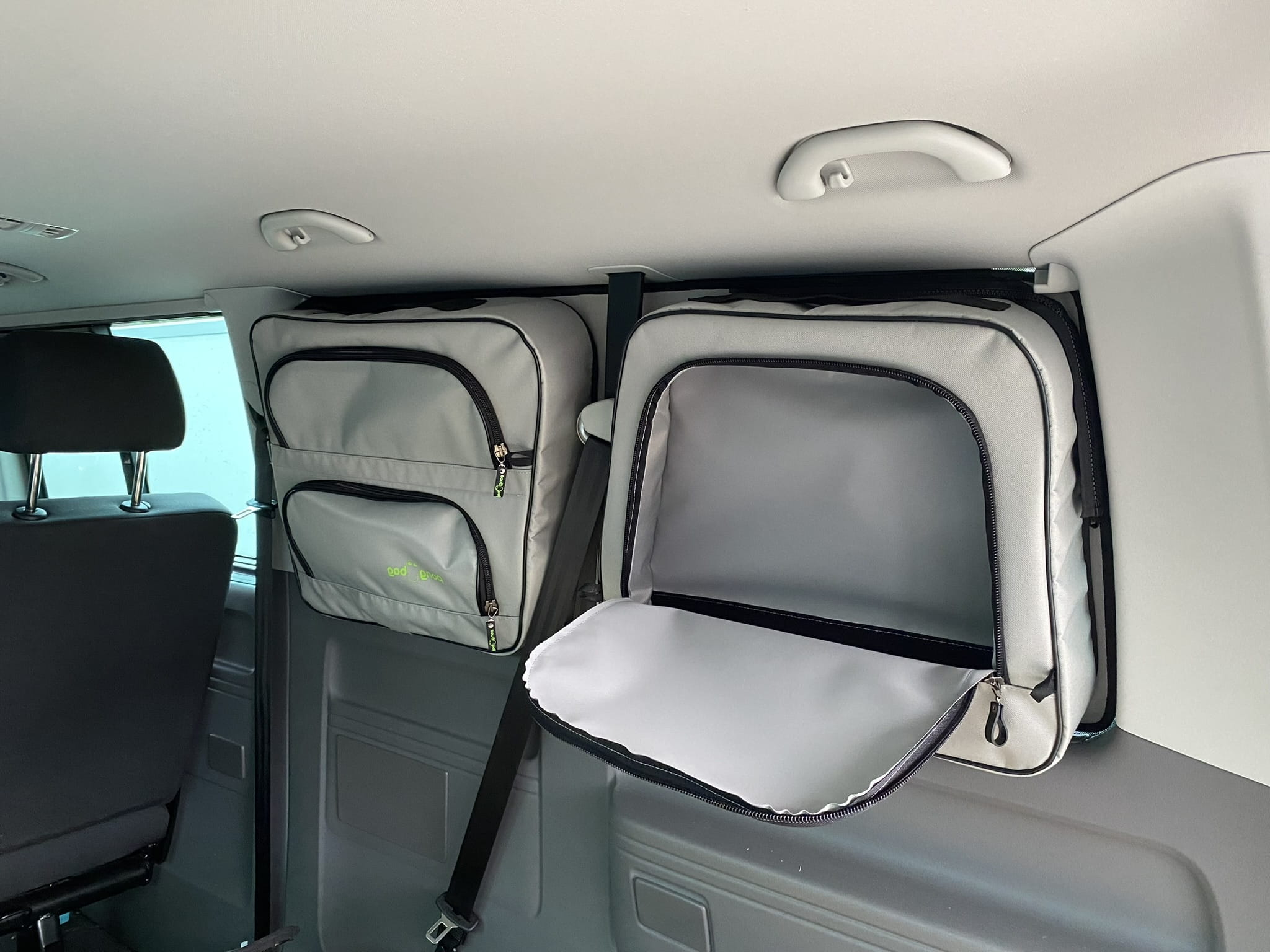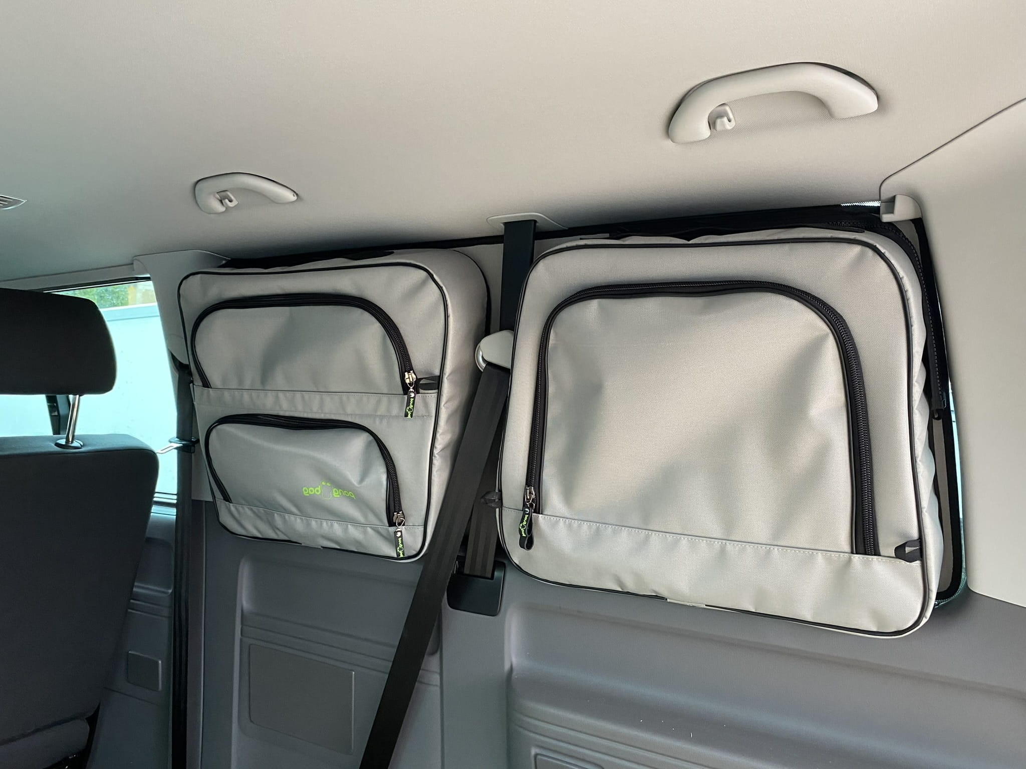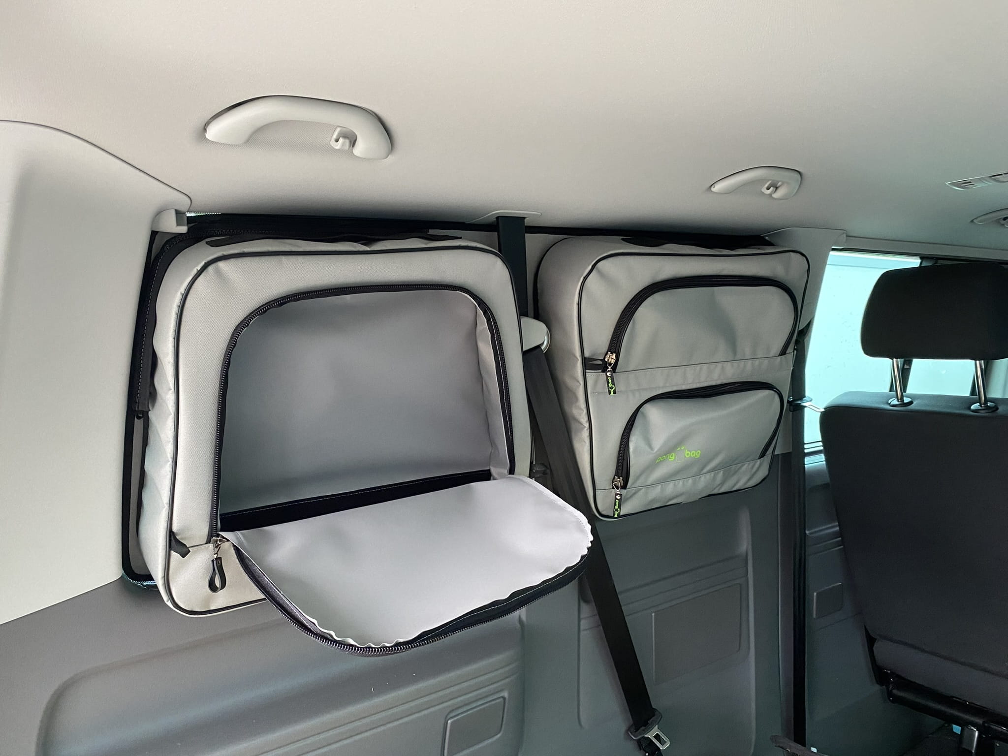 The darkening panel is inserted into the rear side window and the bag is then attached to it using magnets and security clips. This means that the bag can be easily removed, filled and reinserted at any time. With the window bag you create storage space in your Caravelle Camper and always have access to your luggage.
