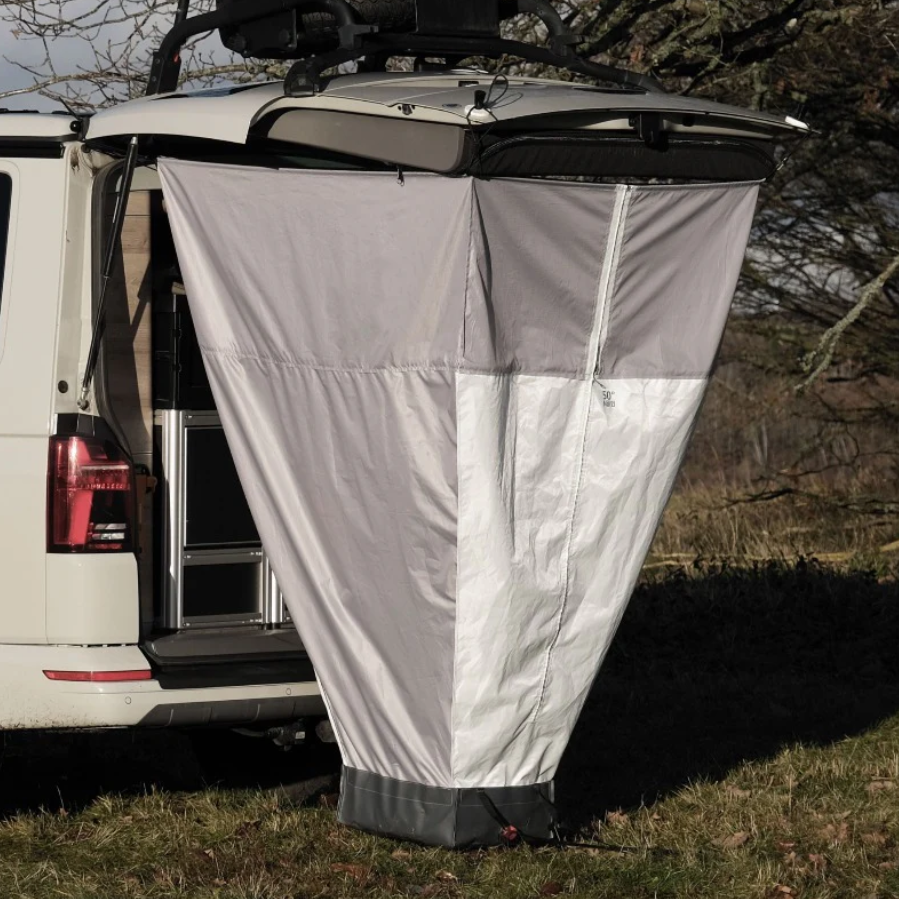 When unfolded, it offers enough space for showering / washing in the vehicle.