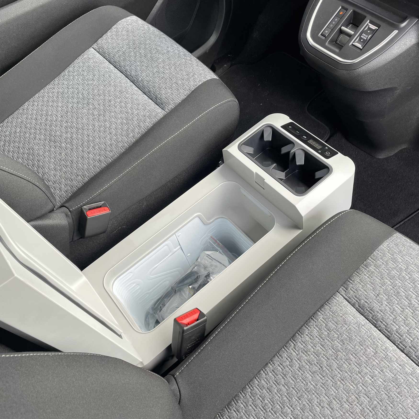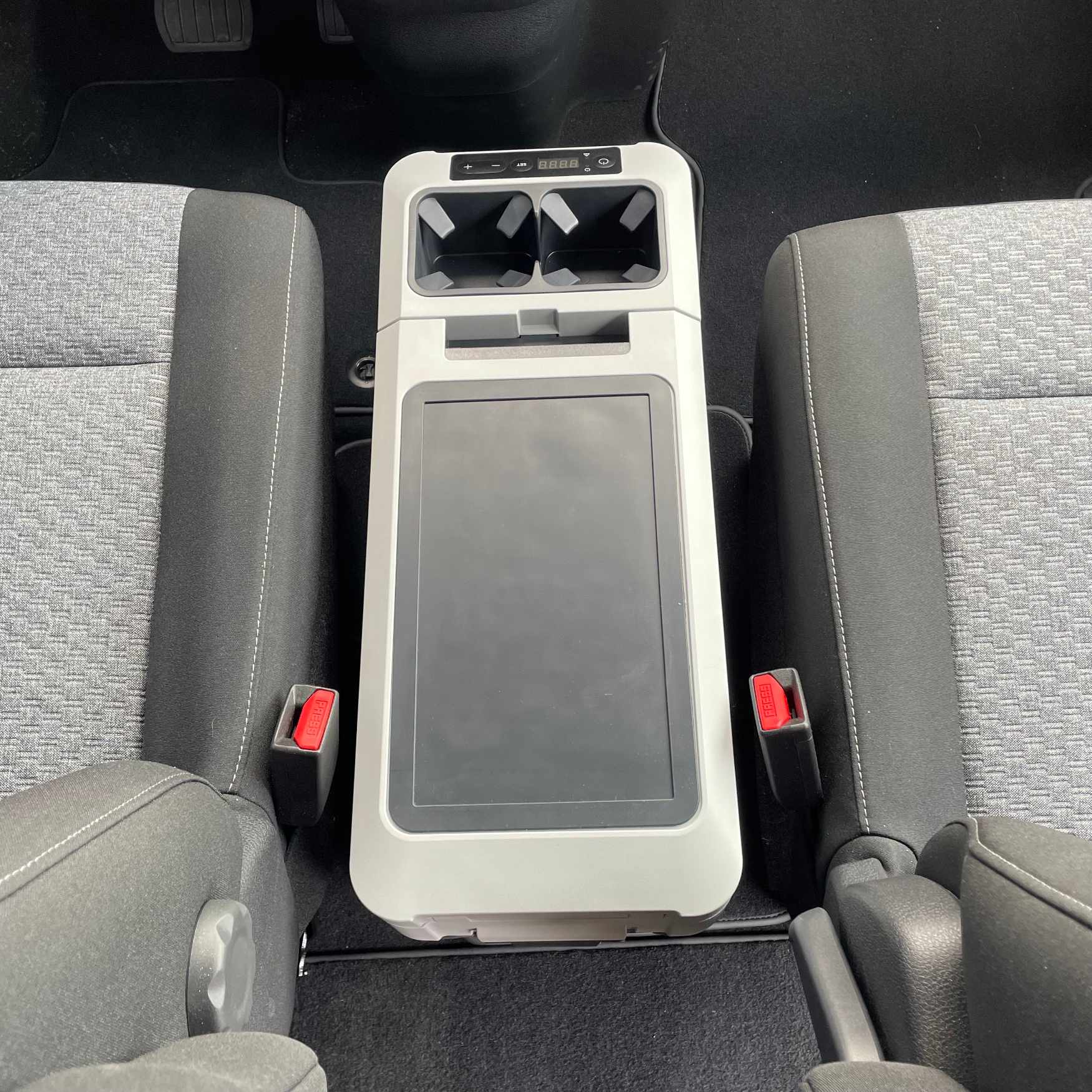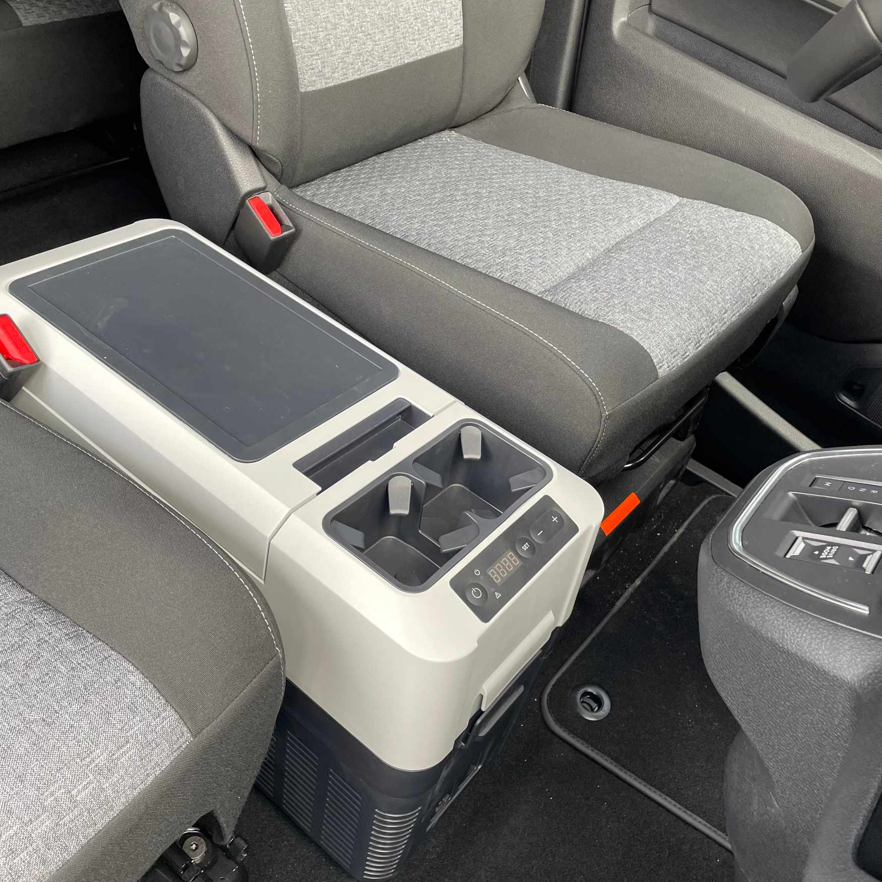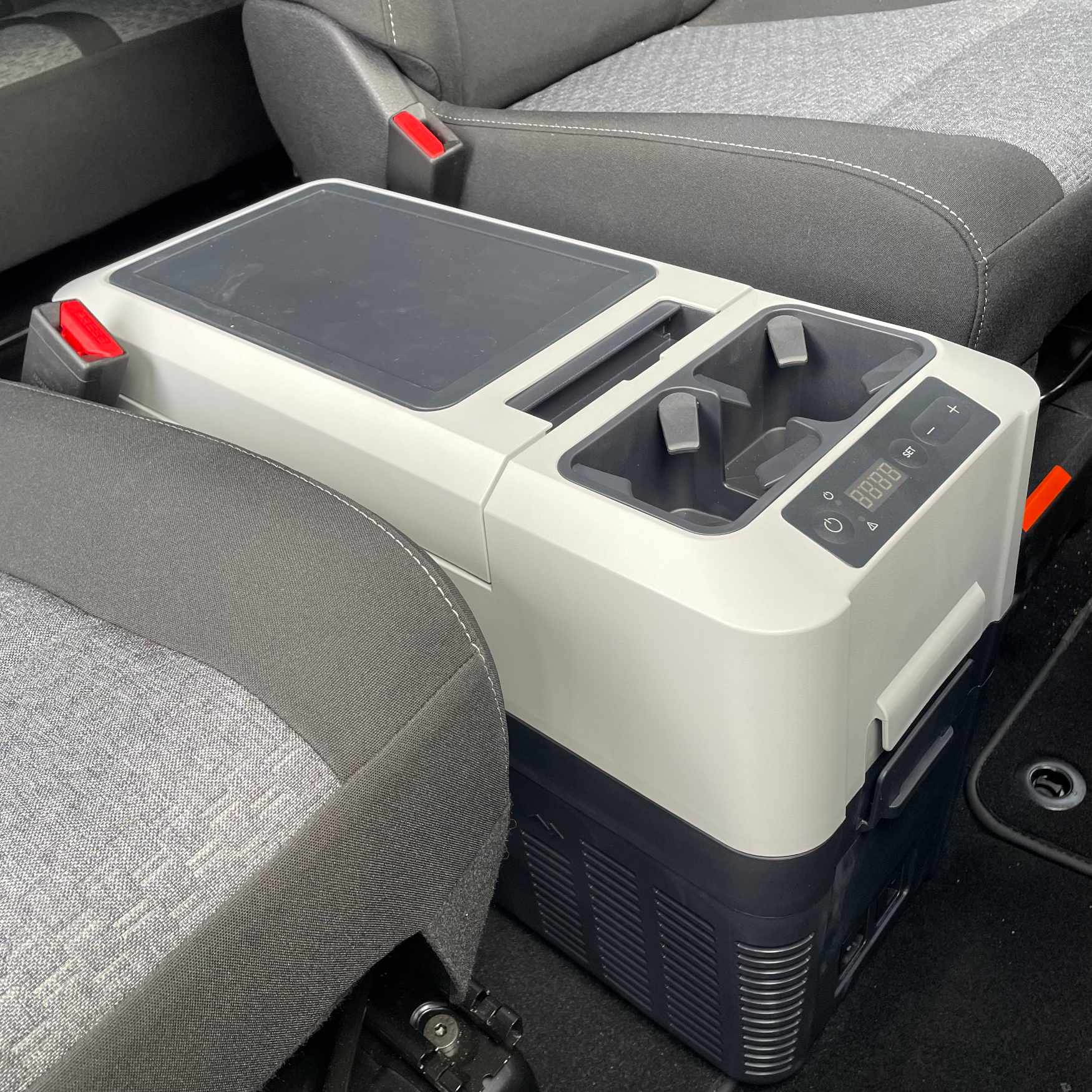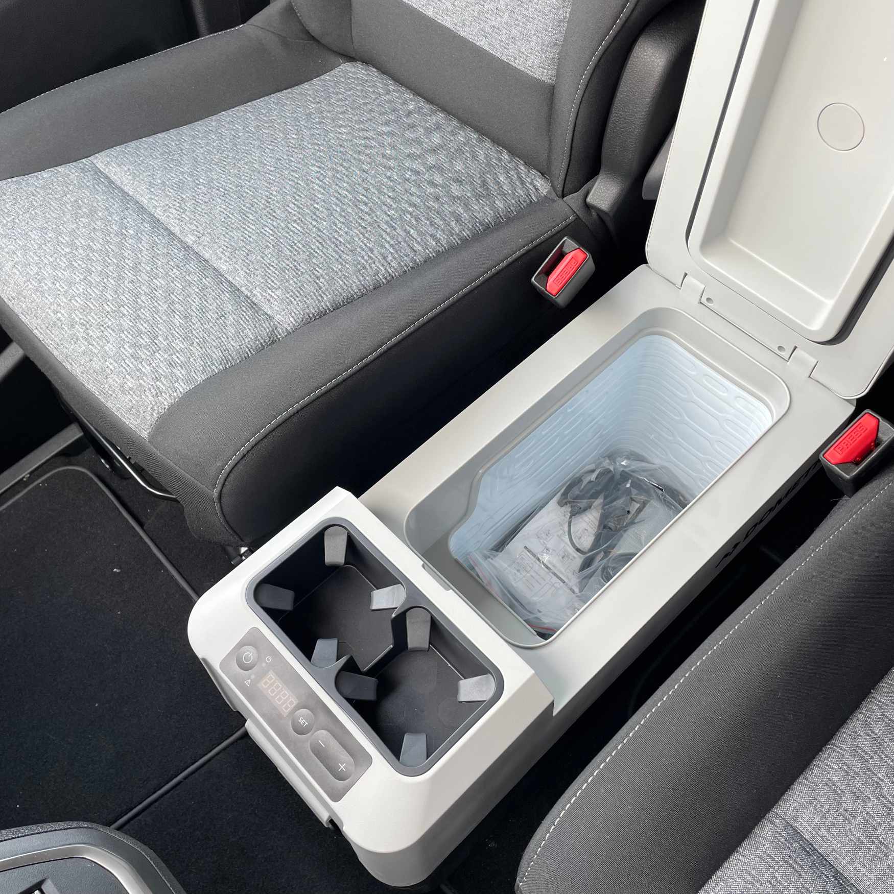 >> Perfectly fits between the seats in the first row of seats >> Extremely compact, exceptionally flat design >> Maximum capacity 13 l >> Cooling from +10°C to -18°C >> Shoulder strap for easy carrying >> Compact and lightweight compressor >> Power supply 12 V / 230 V