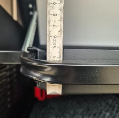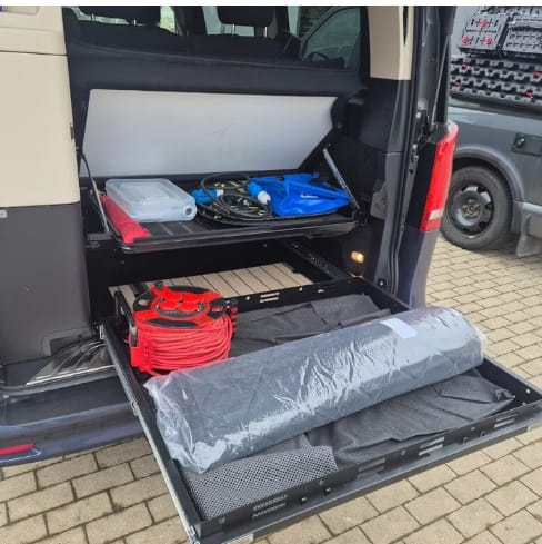 The pictures show a 5 cm shelf, which is covered with a matt black coating. Underneath there is space for two Euroboxes with a standard height of 120 mm or a Eurobox with a standard height of 220 mm. This is of course with our rear drawer. If the rear drawer is not installed, the available space is larger.